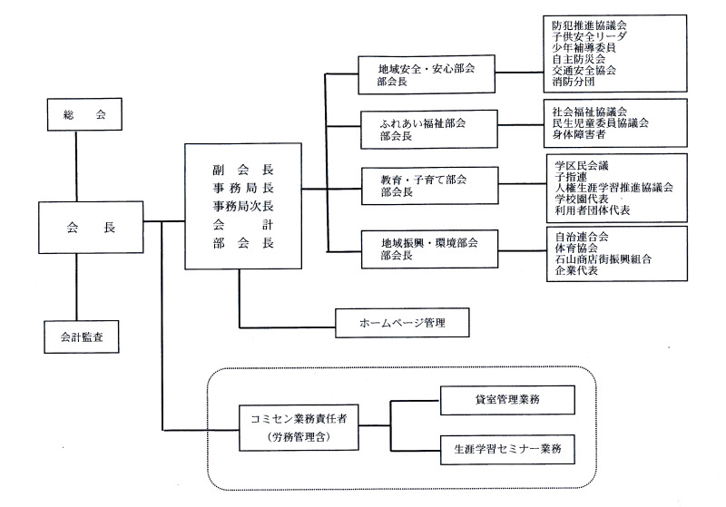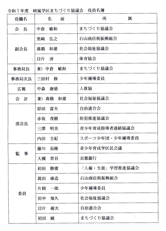 晴嵐学区まちづくり協議会 第1回運営委員会開催 2025年7月22日 19:30~21時 晴嵐コミュニティセンター2階 会議室 1,会長挨拶 中倉敏和 2,組織についての説明 (下記組織図) 3,委員の紹介 (下記役員紹介図) 4,今後の行事について ・ふれあいフェステバル 9/20(土)予定、予備日9/21 第1回実行委員会7/31(木) 5,意見交換 令和7年度 晴嵐学区まちづくり協議会・組織図